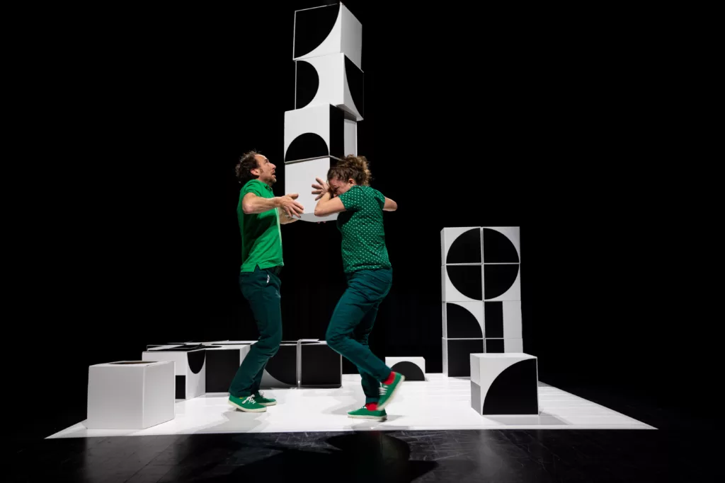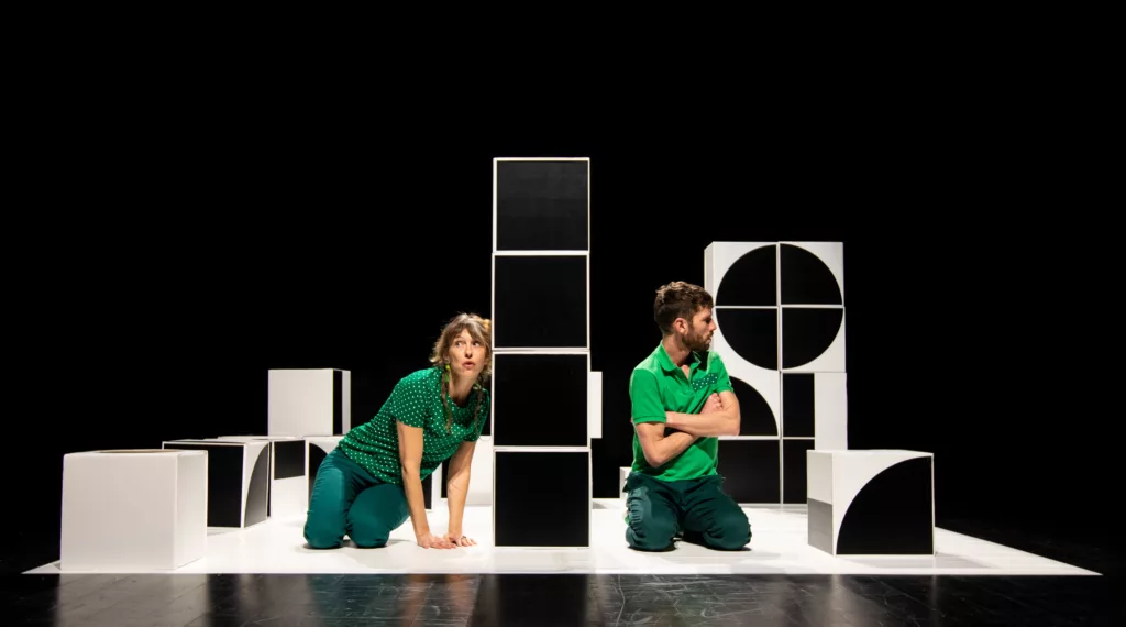 26 cubes en noir et blanc. Tout un univers pour les deux comédiens qui y ajoutent de la couleur, des sons, des mots, mais aussi des éléphants, des poissons, des papillons, un crocodile et un serpent… un drôle d’abécédaire animalier à découvrir !